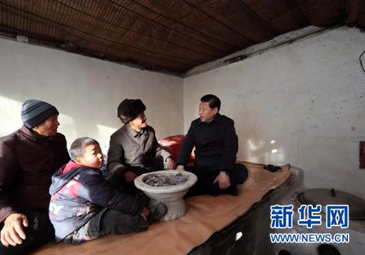 2012年12月29日至30日,习近平在河北省阜平县看望慰问困难群众。这是习近平在龙泉关镇骆驼湾村看望唐荣斌老人一家。