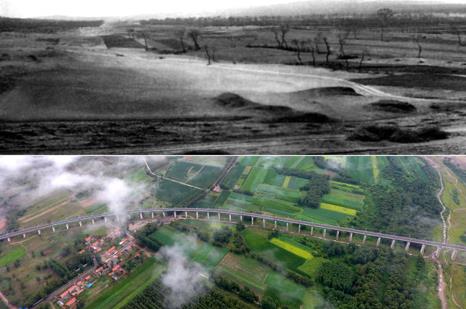 拼版照片:上图为治理前的山西省右玉县右卫镇的景象(资料照片);下图为现在山西省右玉县右卫镇一带的景象。
