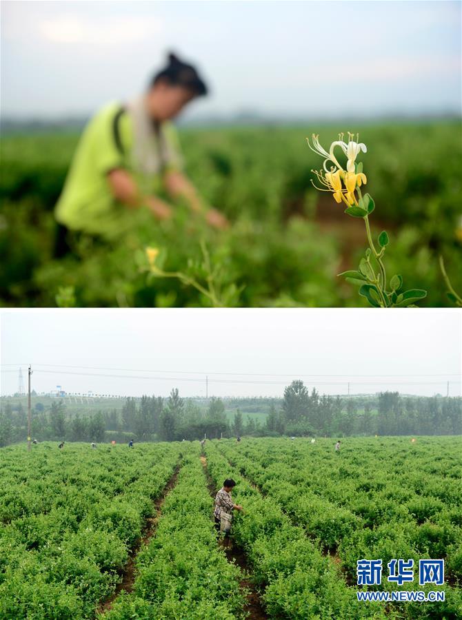 在河南省淅川县九重镇中药材种植基地,农民在采摘金银花(拼版照片,2016年7月30日摄)。新华社记者 冯大鹏 摄