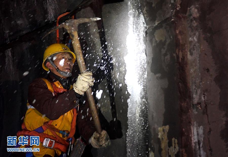 1月25日,洛阳工务段的职工在观音堂隧道内进行打冰作业。 新华社记者 李安 摄