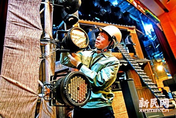 【观众称心最自豪】我是林建飞,人民大舞台的舞台部工程技术人员,家就在不远的江苏启东。我家里有80多岁的老父亲、妻子和女儿,我也渴望回家与亲人团聚啊!但是,新年里剧院的演出表都安排得满满当当,真可谓丰富多彩。为了确保剧院的正常运作,我就主动“留守”在剧院加班。每场演出前夕,我都对所有的舞台灯光、演出道具一一检验,任何不安全的蛛丝马迹都不放过。所以,人民大舞台的同事们都给我起了一个外号“林放心”。是呀,我的工作虽然普普通通,但是必须让观众们放心和称心!(本报记者 郭新洋 摄)