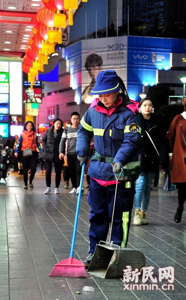 【南京路上最热闹】我是周娟,在黄浦区欣谊保洁公司做清道工。我老家在江苏淮安,已连续8年没有回家过年了,爹妈特别想我,我也梦想回家过年。但是每逢年节,南京路步行街上游客如潮,五湖四海的游客比平常多出好几倍,这是我一年中清扫工作最忙碌的时候。南京路是大上海的“名片”,我和我的同事们必须让这张“名片”保持得清清爽爽。如今,社会各界都很体贴我们环卫职工,我们作为上海的“城市美容师”,更有责任让大都市变得整洁美丽哦!(杨建正 摄)