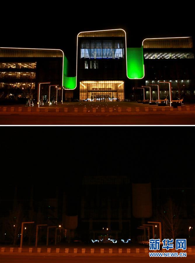 这是河北省香河县文化艺术中心在关灯前后的对比(拼版照片,3月24日摄)。 3月24日,一年一度的“地球一小时”活动在各地举行。 新华社记者 王晓 摄