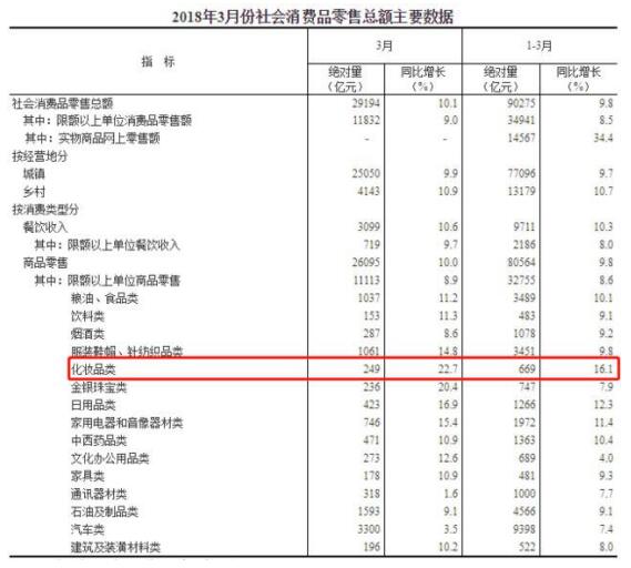 新零售,近年最热词汇之一,我国结合新零售的市场经济时代也已经开启。近日,国家统计局发布关于我国零售市场的最新数据,3月份的社会消费品零售近3万亿,同比增长10.1%,新零售强有力推动总体零售市场发展。而在这零售总额主要数据,最瞩目的就是化妆品。我国3月份化妆品零售额达249亿,同比大涨22.7%,远远领先其他项目增长。