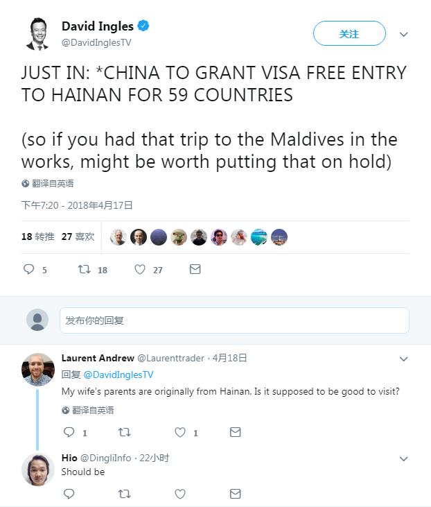 网友“David Ingles”在个人推特账号上第一时间转发了“海南免签入境政策适用国家从26国放宽至59国”的相关消息,并评论道:“如果你有去马尔代夫的计划,那你可以先缓缓了。”澳大利亚网友“Laurent Andrew”则在“David Ingles”这条推文下附和道:“我妻子的父母就来自海南,去那儿旅游应该不错吧?”