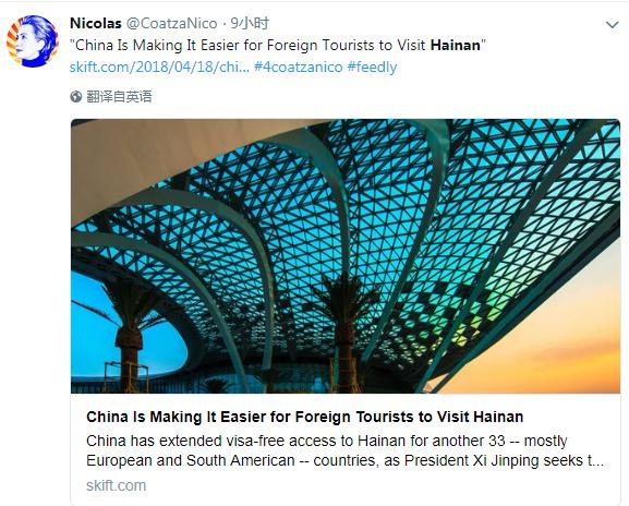 网友“Nicolas”转发了美国旅游新闻网站Skift关于此事的报道,并写道“外国游客到海南旅游变得越来越方便了”。