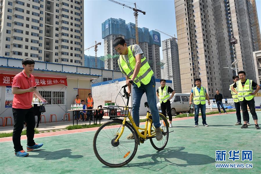 4月27日,一名中铁十七局的工人在参加慢骑自行车比赛。当日,中铁十七局集团建筑公司在太原市青运村项目部举行了一场趣味运动会,工人们在欢声笑语中迎接“五一”国际劳动节的到来。 新华社记者曹阳摄
