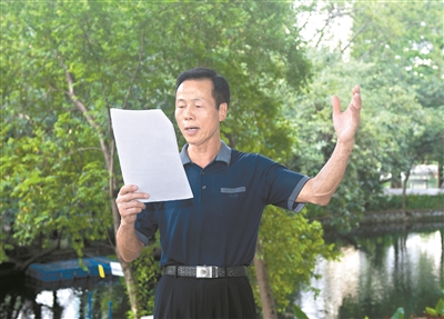 今年70岁的叶昌汉头上只有几根白发,穿着干净整洁的蓝色衬衫,看起来十分精神。记者见到他时,他刚从广州市老年大学晓园路校区上完声乐课回来。每周一三五的上午9点,他都要准时在这里上声乐课。