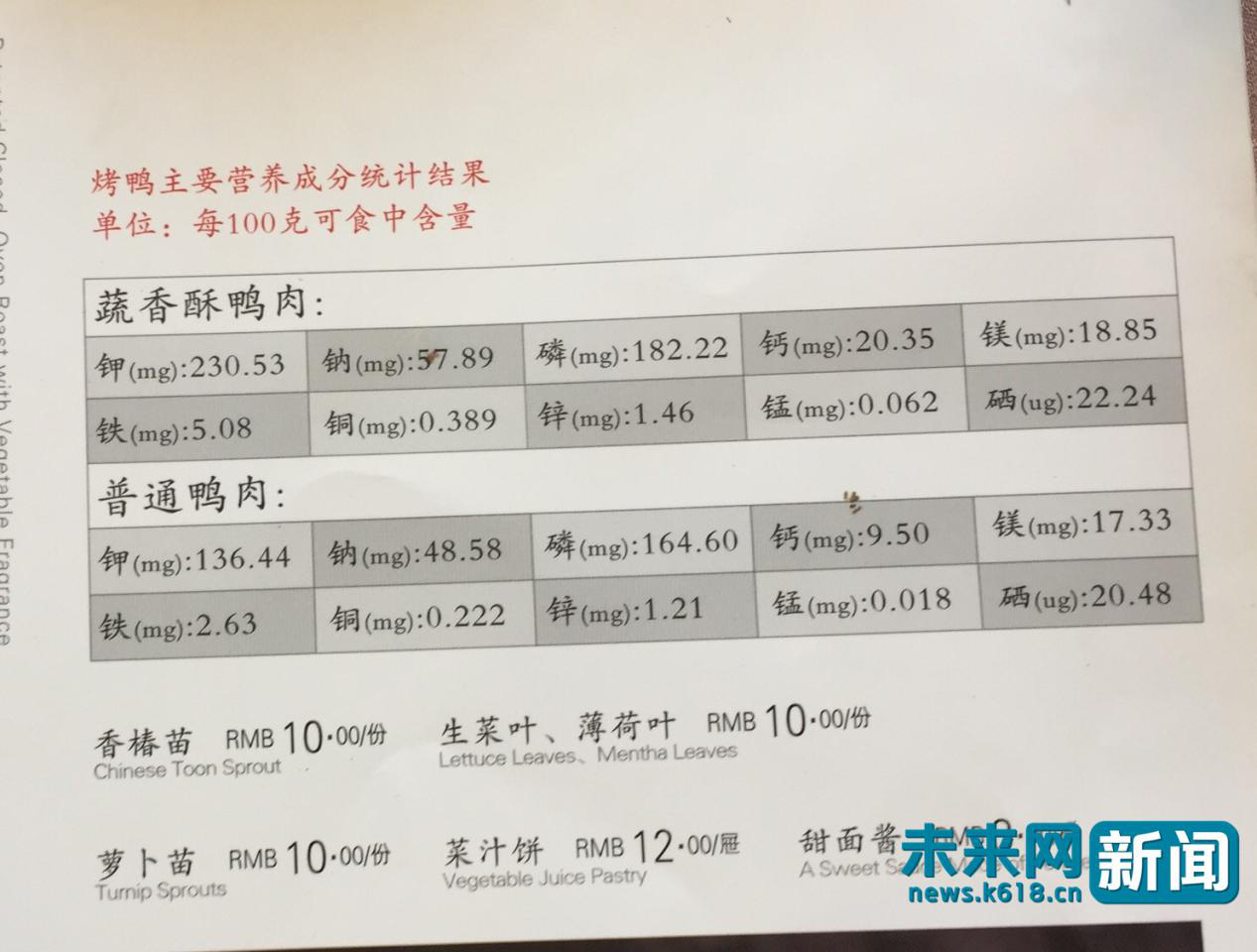 在“便宜坊”的菜单上写着烤鸭主要营养成分含量 未来网记者何欣 摄