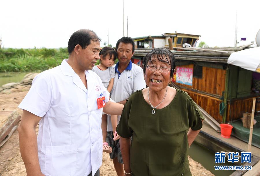 6月27日,李绍友(左一)来到洪泽湖畔一户渔民家为患者问诊。 新华社记者 季春鹏 摄