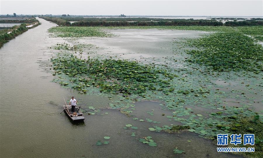 6月27日,李绍友在洪泽湖上划着小船出诊(无人机拍摄)。 新华社记者 季春鹏 摄