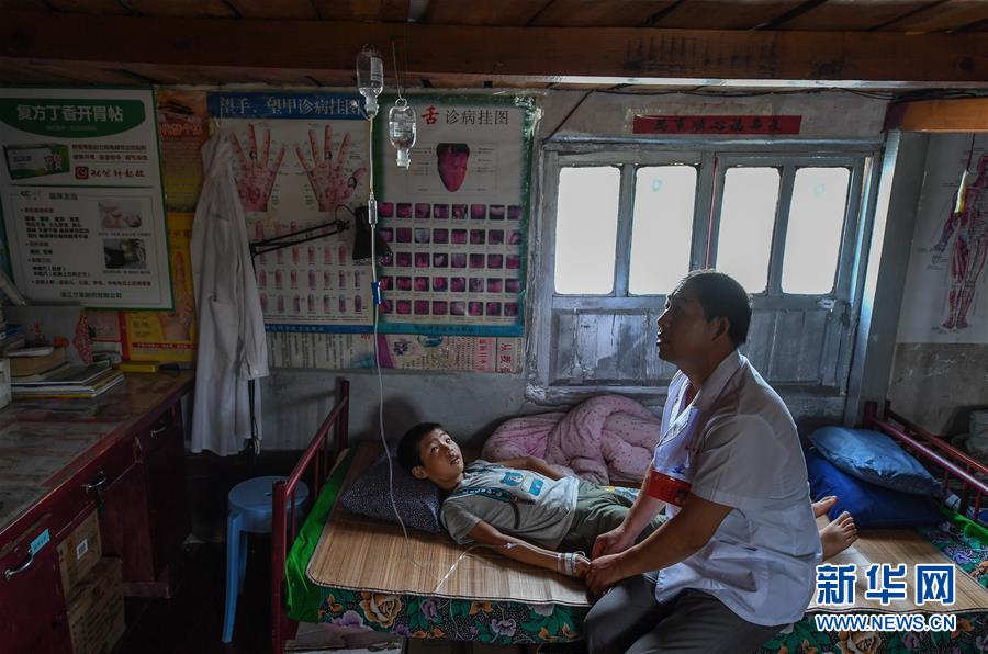 6月27日,李绍友在自家船上的卫生室为一名渔家孩子看病。 新华社记者 季春鹏 摄
