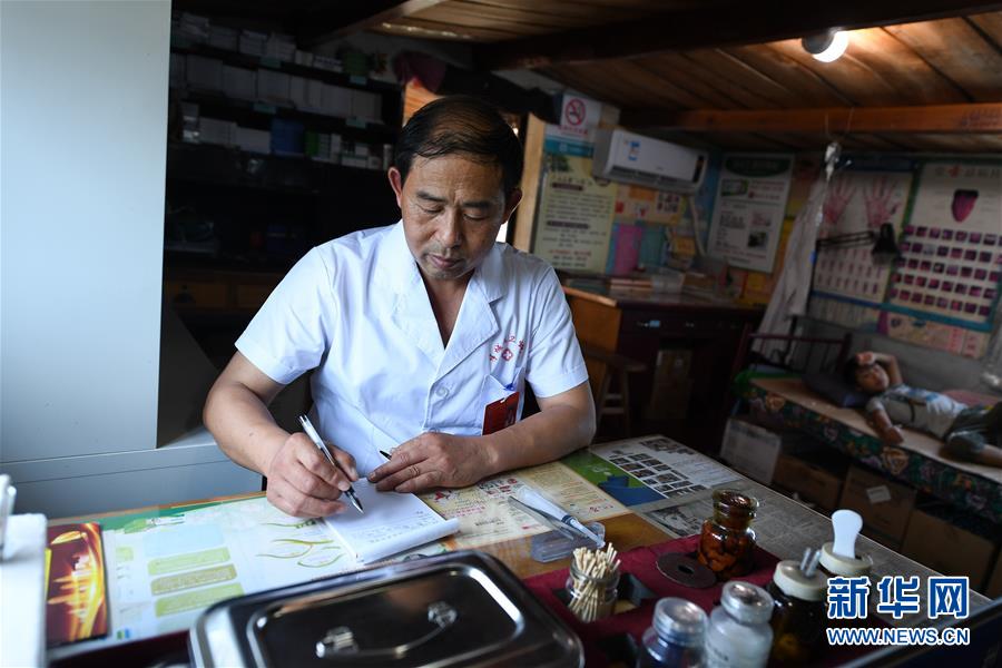 6月27日,李绍友在自家船上的卫生室为患者开处方。 新华社记者 季春鹏 摄