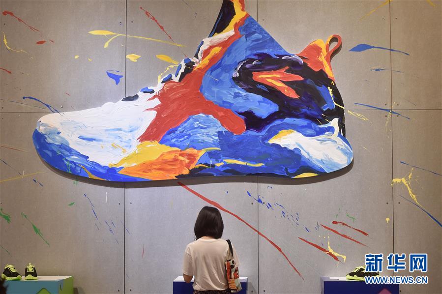 在一年一度的中国(晋江)国际鞋业暨国际体育产业博览会上,一位客商在了解安踏运动鞋(2017年4月18日摄)。