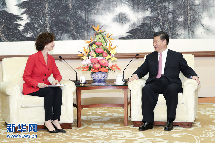 7月16日,国家主席习近平在北京钓鱼台国宾馆会见联合国教科文组织总干事阿祖莱。新华社记者谢环驰摄