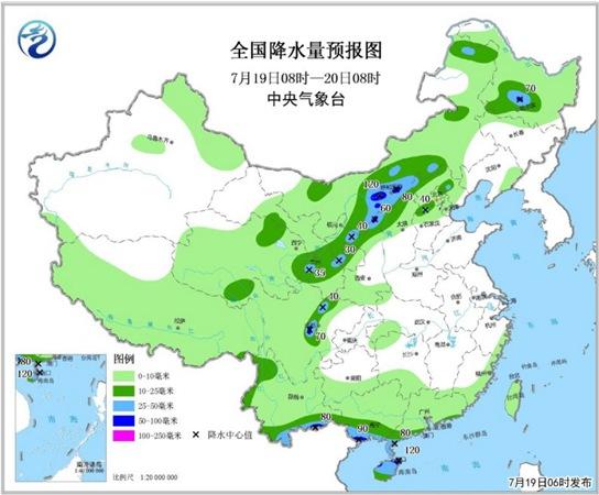 明天,降雨持续,雨势略有减弱。预计,内蒙古东北部、黑龙江中部、西北地区东部、西南地区南部等地部分地区有中到大雨,其中,内蒙古中西部、甘肃东部等地部分地区有暴雨,局地大暴雨(100~110毫米);上述部分地区将伴有短时强降水和雷暴大风等强对流天气。新疆南部和甘肃河西等地部分地区有4~6级及以上大风。