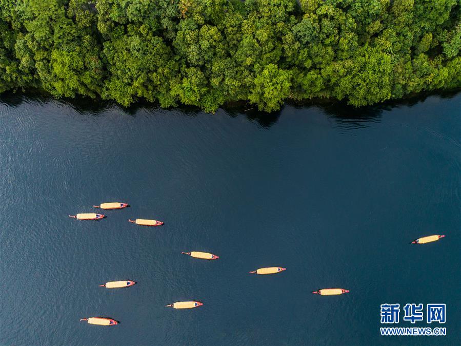7月23日,游客乘船在新安江浙江建德段江面上游玩(无人机拍摄)。