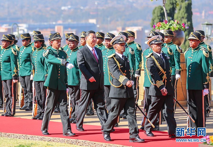 7月24日,国家主席习近平在比勒陀利亚同南非总统拉马福萨举行会谈。会谈前,拉马福萨为习近平举行隆重欢迎仪式。 新华社记者 谢环驰 摄