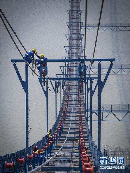 工人在武汉杨泗港长江大桥施工现场架设主缆。该桥建成后将成为世界上跨度最大的双层悬索桥。 新华社记者肖艺九摄