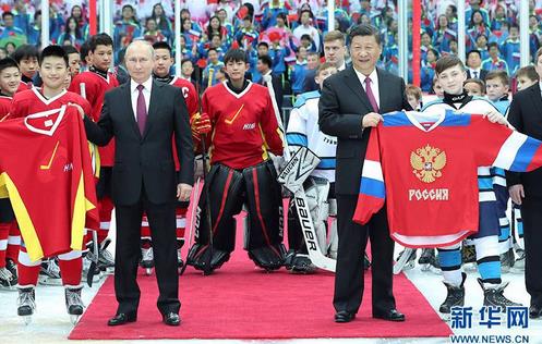 今年6月,习近平同普京在天津观看中俄青少年冰球友谊赛,共同执冰球落向冰面,为比赛开球。习近平对普京说,中俄两国青少年的比赛令人振奋,从中也看到了两国青少年的友谊。普京表示,希望这样的青少年冰球运动能成为俄中两国友谊的新纽带。