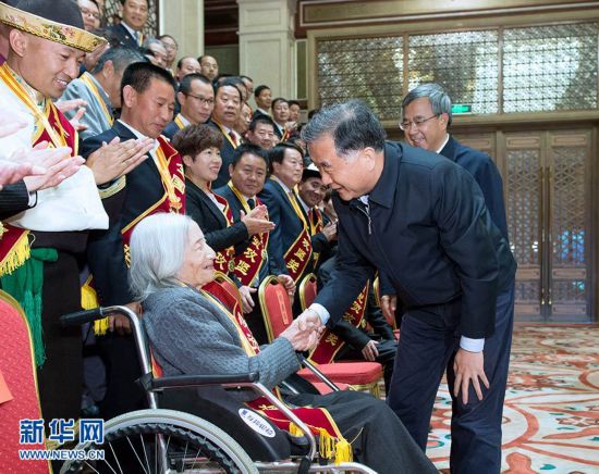 10月17日,中共中央政治局常委、全国政协主席汪洋在北京会见全国脱贫攻坚奖获得者,并参观“决胜2020”脱贫攻坚展。 新华社记者 刘彬 摄