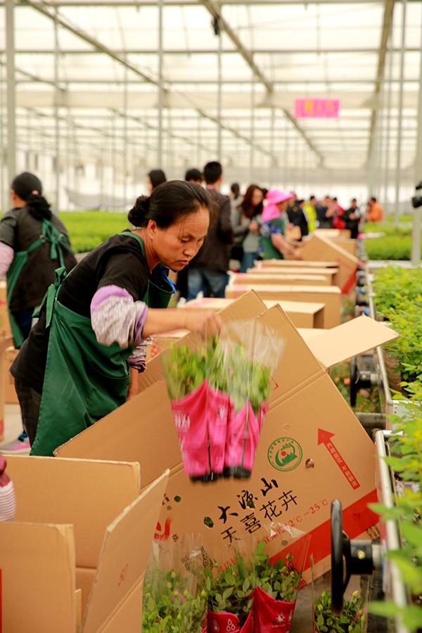 花卉产业园建成后,管理方就地招聘工人,解决农民的就业问题。目前,整个花卉产业园已解决2300多名当地贫困群众就近务工,农民年增收达到4600万余元。在解决增收的同时,农民可以在花卉园区学到种花技术。如果有多余的土地还可以自己发展家庭农场,自己当老板。据园区内的天禧园艺有限责任公司生产部经理助理武光亮透露,目前,该公司已经成功孵化出家庭农场10余个,这些家庭农场的综合产值已经超过1000万元。
