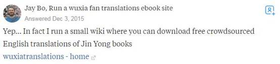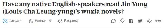 在美国问答类网站“Quora”上,关于金庸及其小说的提问有十多条。其中一个提问是,“在西方有人喜欢金庸的功夫小说吗?”一名曾在中国学过的中文的外国网友“Imre Kovacs”答道:“我几年前看过倚天屠龙记电影。我非常喜欢它。事实上,我最早知道的一些普通话词汇就是从香港邵氏电影拍的武侠电影中学的,例如‘岂有此理’、‘后会有期’、‘不必多礼’、‘阁下’、‘少爷’等。”另一名网友“Jay Bo”在回答关于“有没有以英语为母语的人读过金庸”的问题时说:“是的。事实上,我运行了一个小网站,你可以下载由书迷们翻译的金庸作品的免费英文版。”
