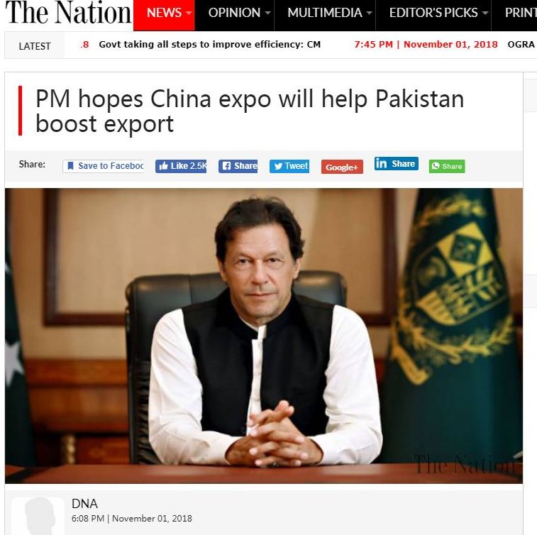 巴基斯坦总理希望借助中国首届进博会为巴企业提供更多发展机遇。图片来源:巴基斯坦《国民报》网站截图