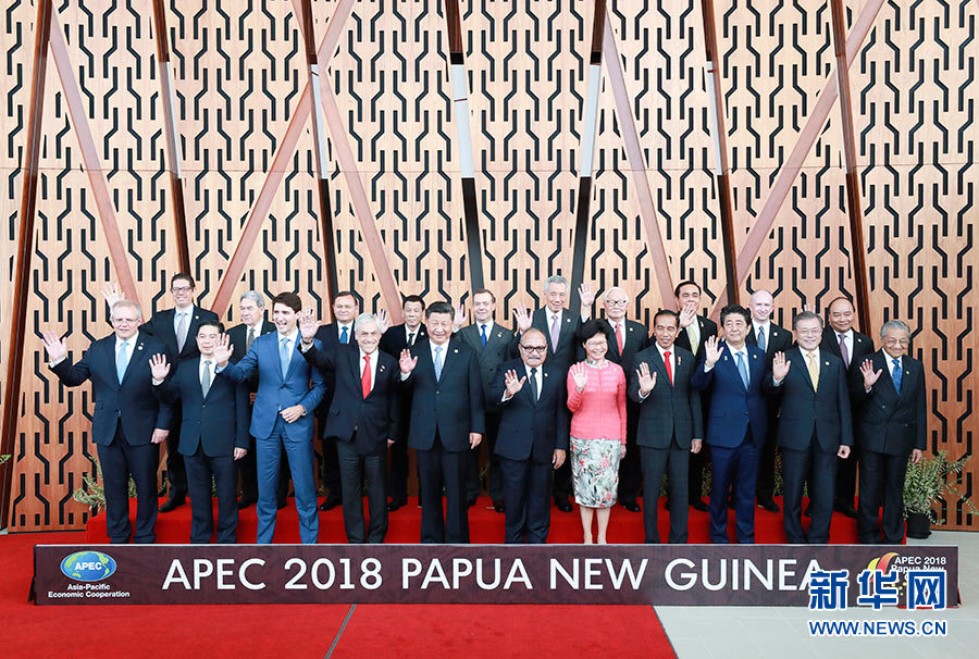 11月17日,国家主席习近平应邀出席在巴布亚新几内亚莫尔兹比港举行的亚太经合组织工商领导人峰会并发表题为《同舟共济创造美好未来》的主旨演讲。同日,习近平还出席了亚太经合组织领导人同工商咨询理事会代表对话会。对话会前,习近平同其他亚太经合组织成员经济体领导人、代表合影。 新华社记者 庞兴雷 摄