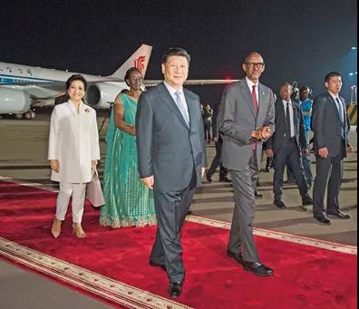 在卢旺达,当习近平乘坐的专机抵达基加利国际机场时,受到卢旺达总统卡加梅和夫人珍妮特等热情迎接。
