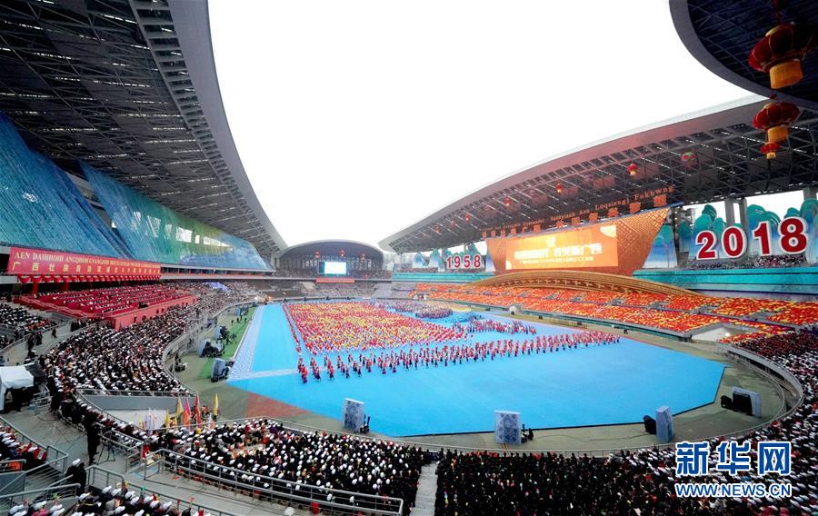 12月10日,广西壮族自治区成立60周年庆祝大会在广西体育中心隆重举行。这是庆祝大会上的群众文艺表演。 新华社记者 陈建力 摄