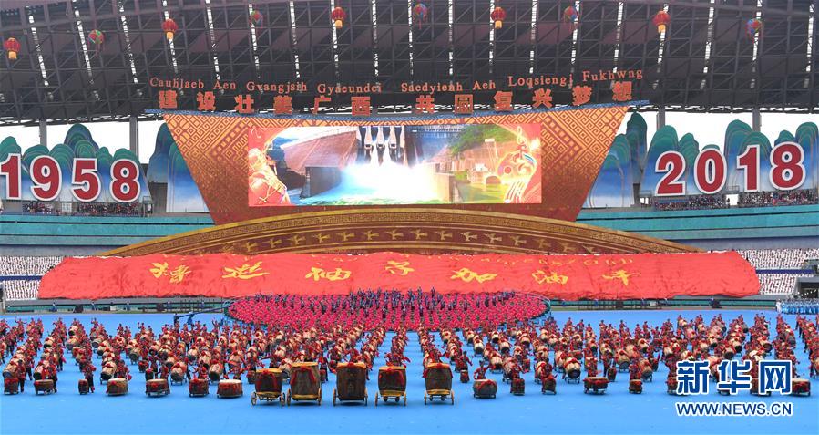 12月10日,广西壮族自治区成立60周年庆祝大会在广西体育中心隆重举行。这是庆祝大会上的群众文艺表演。 新华社记者 周华 摄