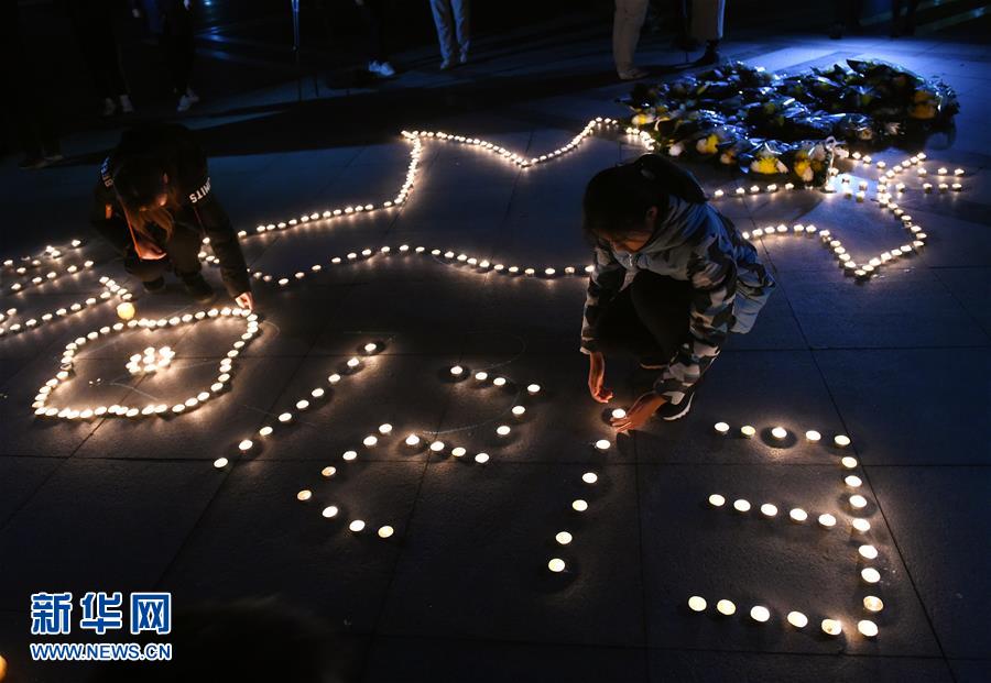 12月12日,学生将组成纪念图案的白烛摆放整齐。 当晚,南京东南大学学生在校园举行“烛光祭”活动,悼念南京大屠杀遇难同胞。学生们点燃白烛,献花默哀,表达哀思。 新华社记者 孙参 摄