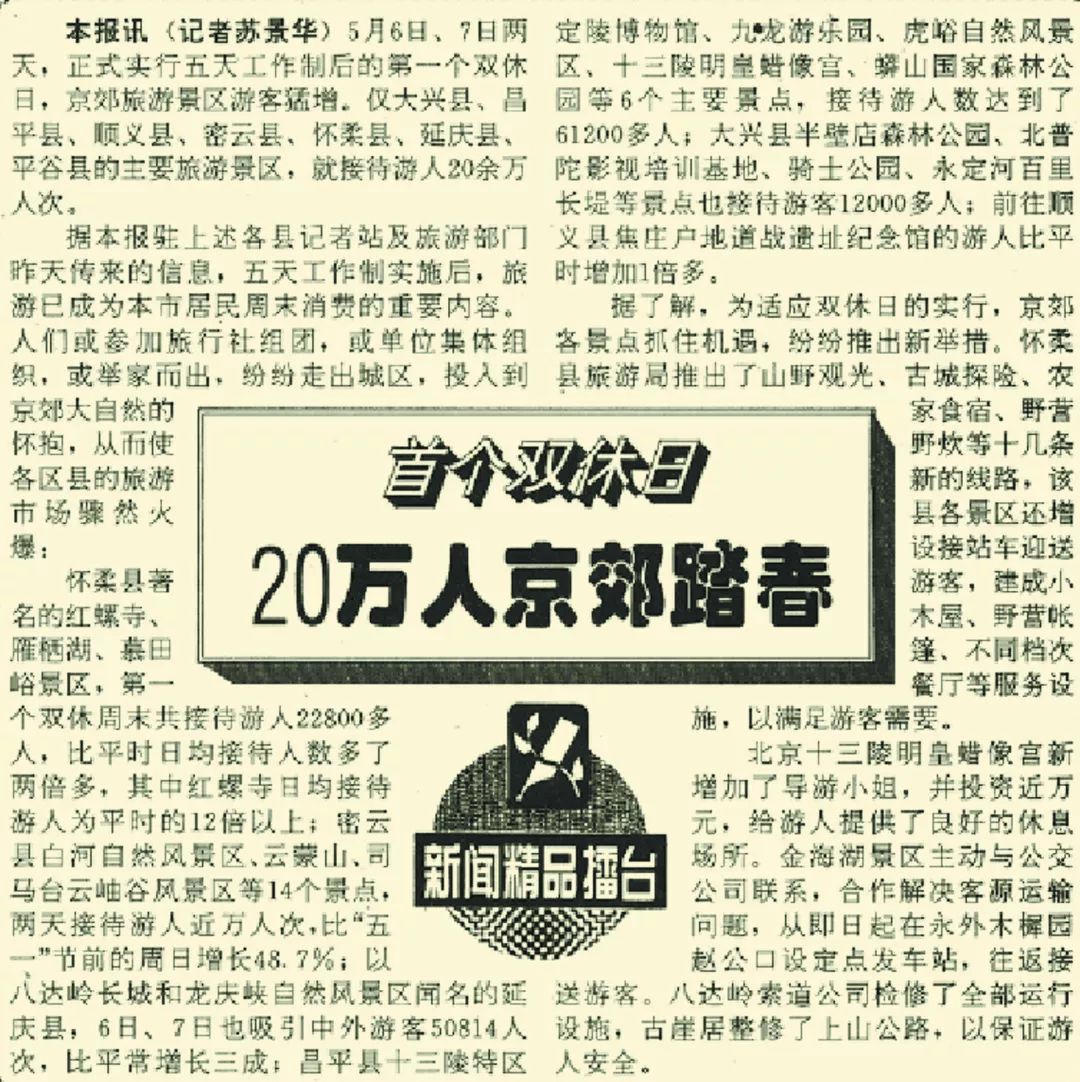 1995年5月6日、7日两天,是正式实行五天工作制后的第一个双休日。京郊旅游景区游客猛增,接待游客20余万人次。自此,旅游成为本市居民周末消费的重要内容。