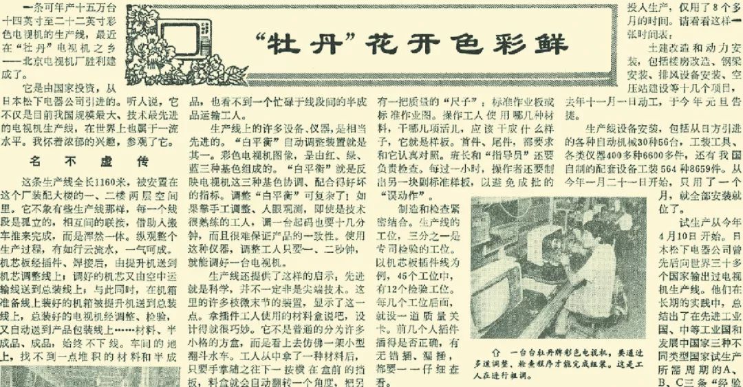 1979年,北京电视机厂与日本胜利公司(JVC)合作组装JVC彩电获得成功,全国第一台彩电在牡丹下线。1981年7月22日,与日本松下电器公司合作建成年产15万台彩色电视机生产线开工,生产牡丹牌14寸彩色电视机。