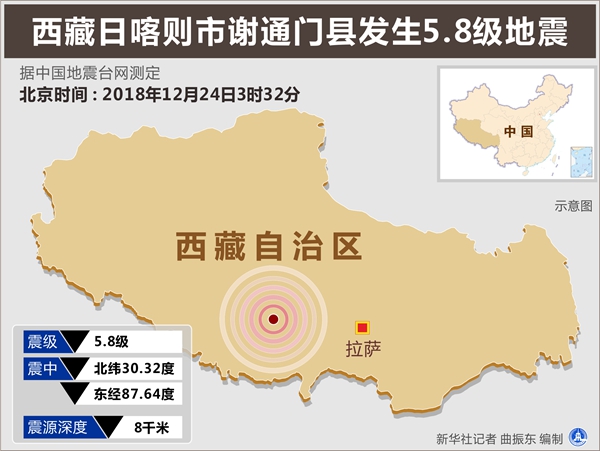 新华社拉萨12月24日电(记者 白少波)据中国地震台网测定:12月24日3时32分,西藏日喀则市谢通门县(北纬30.32度,东经87.64度)发生5.8级地震,震源深度8千米。当地工作人员报告,震中部分房屋出现裂缝,截至目前暂无人员伤亡报告。