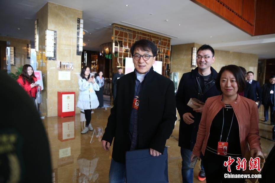 3月2日下午,全国政协委员成龙从驻地出发。当日,全国政协委员们从驻地前往人民大会堂,参加全国政协十三届一次会议预备会。中新社记者 韩璐 摄