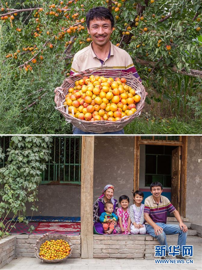 拼版照片:上图为新疆阿克陶县巴仁乡古勒瓦克村村民胡达拜尔迪·巴拉提在自家杏园里展示巴仁杏;下图为胡达拜尔迪·巴拉提一家在新盖的富民安居房前合影(2017年7月11日摄)。胡达拜尔迪·巴拉提一家靠种植巴仁杏实现脱贫。2016年,他将政府提供的扶贫资金投入古勒瓦克村杏产业专业合作社,分红得到5000元。