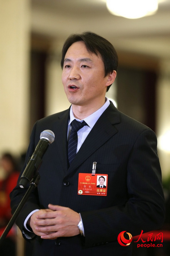 全国人大代表郭锐在“代表通道”接受采访。(人民网记者 翁奇羽 摄)