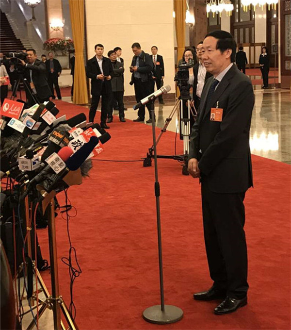 图为3月3日14时30分许,全国政协十二届五次会议开幕前,人民大会堂北大厅的“部长通道”上,国家文物局局长刘玉珠回答记者提问。图片来源:中国文物报