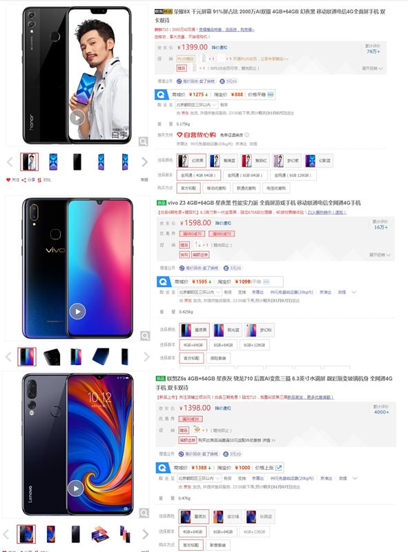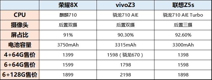 最后要对比的则是三者的价格。同样是千元机定位的三款手机,在内存与运存的搭配方案上都出奇一致,均配有三个搭配方案。入门的4+64G方案,满足一般使用需求,联想Z5s售价1398元排在首位,其次是荣耀8X的1399元、而vivoZ3稍贵,售价1598元。需要稍加注意的是,vivoZ3的4+64G入门版搭载的是高通骁龙670芯片,并非标配的710芯片,性价比最低。