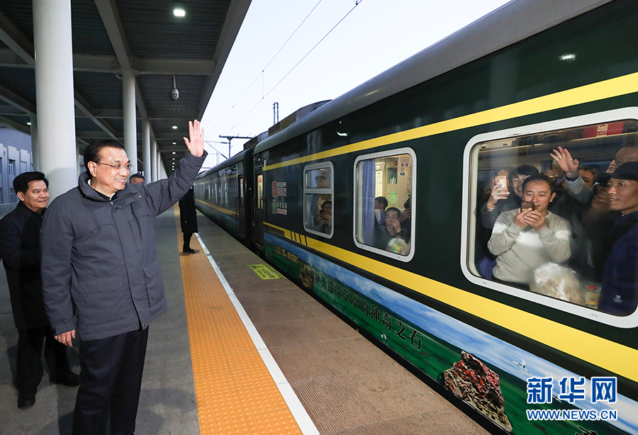 2月1日至2日,中共中央政治局常委、国务院总理李克强在内蒙古自治区乌兰察布市考察。这是2月1日,李克强来到集宁南火车站,登上包头开往大连的K1567次列车,看望慰问返乡旅客。列车开动时,李克强在站台上与旅客相互挥手道别。 新华社记者 姚大伟 摄