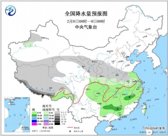 图3 全国降水量预报图(2月6日08时-7日08时)