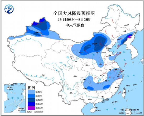受较强冷空气影响,新疆北部、内蒙古中西部、西北地区东北部、东北地区东南部、华北北部和西部、黄淮北部、江淮南部、江南北部和西部、贵州东部等地气温将先后下降6~8℃,新疆北疆北部、内蒙古中部偏南地区、吉林东部、辽宁东部等地降温幅度可达10~12℃,局地12℃以上,上述地区伴随出现4~6级风、阵风7~8级(见图2)。中央气象台2月6日06时发布大风降温预报。