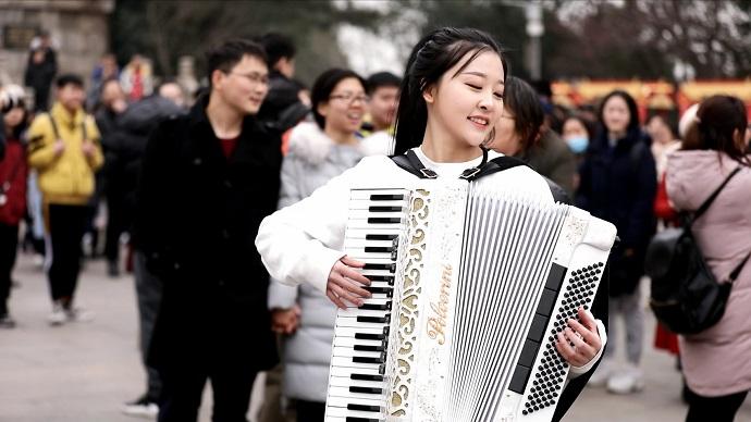 《洪湖水浪打浪》,竹笛清脆悦耳的旋律,响彻黄鹤楼,将人们的视线从地面拉升至楼宇。弦弦演绎的琵琶声,将《龙船调》的风韵向人群抛洒。竹笛琵琶和鸣,把一曲曲湖北风情的音乐流淌,激起现场游客浓浓的家国情怀。