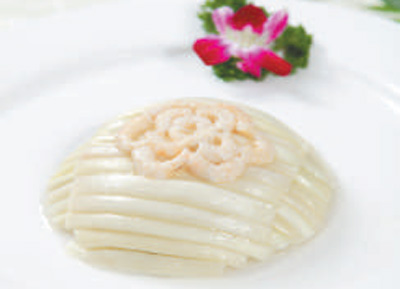 碗口盖盘子倒扣,将虾仁当中做装饰,淋入汤汁即可。