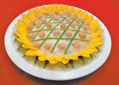 将什锦配料(水发海参、水发干贝、鲜虾仁、金华火腿、蒸蛋黄糕、香菇、口蘑子、毛豆粒、裙边、鱼肚)切丁后,放入沸水中翻滚片刻后捞出;起锅将香油烧热后放入葱姜末,然后下入什锦配料,加料酒和盐翻炒熟后捞出。黄瓜切成三角状,蒸蛋黄糕切成大、中两个型号的鸡心状,芸豆切成长条状备用。将鸡脯肉剁成泥,加入盐、料酒、蛋清、三套汤(鸡鸭肉等熬制)调制成鸡肉茸。把备好的什锦配料放入盘中央,在上面蒙上一层调制好的鸡肉茸,在盘最外围摆放切好的黄瓜,蒸蛋黄糕片由外到内摆放两圈,大号在外,中号在内。把芸豆长条在中央摆成网状,在每个网格中摆放一粒水发干贝。准备就绪后,在盘上覆盖一层保鲜膜,放入蒸锅蒸3分钟左右取出。熬制流水芡,在盘中均匀地浇洒少许,以提亮色泽。