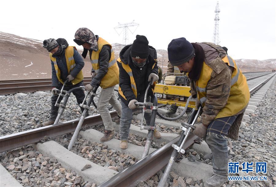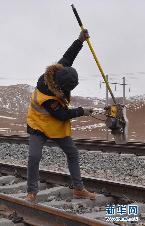 青藏铁路唐古拉线路工人维修铁轨(1月28日摄)。 新华社记者 周健伟 摄