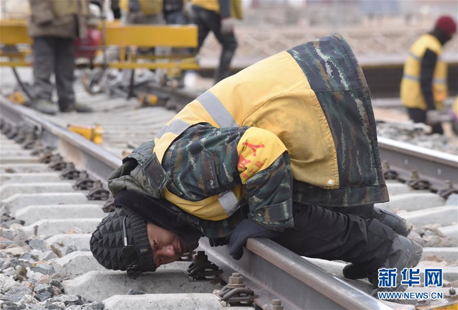 扎西旺堆跪在铁轨上观察铁轨水平高度(1月28日摄)。 新华社记者 周健伟 摄