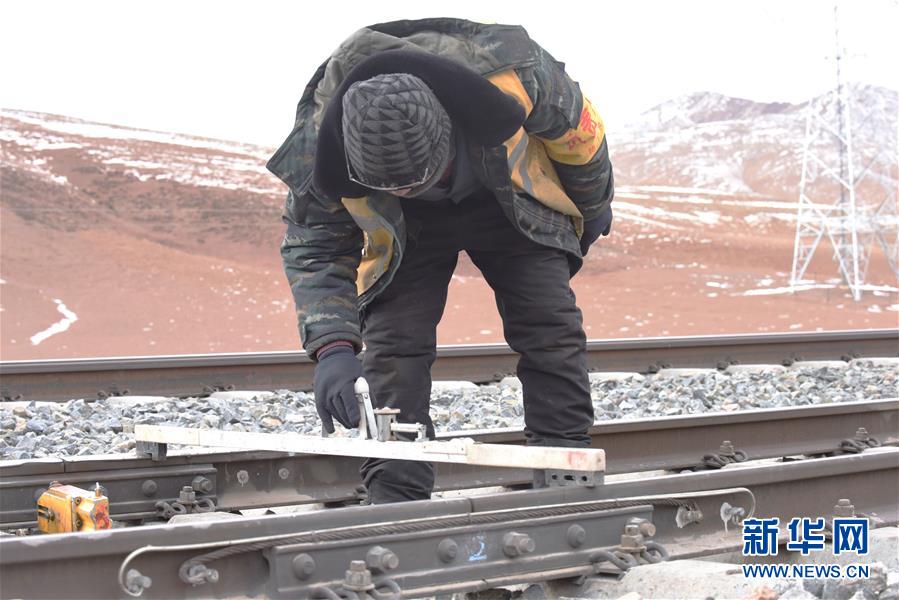 青藏铁路唐古拉线路工人用道尺检测轨道(1月28日摄)。 新华社记者 周健伟 摄